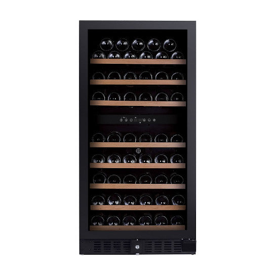 Art. DX-94.270DBK - Cantinetta 2 Temperature • capacità 94 bottiglie bordolesi 75 cl. • filtro anti raggi ultravioletti • display digitale con touchpad • filtro ai carboni attivi • 2 temperature per vini bianchi e rossi • zona superiore regolabile tra 5 e 12°C • zona inferiore regolabile tra 12 e 22°C • differenza max temp. tra le 2 zone 8°C • ripiani in legno scorrevoli e removibili • illuminazione a LED azzurri • cerniera porta a destra reversibile • serratura con chiave • autoventilazione dallo zoccolo • funzionamento a compressore • consumo 314 KWh/anno – classe D • peso 72 kg