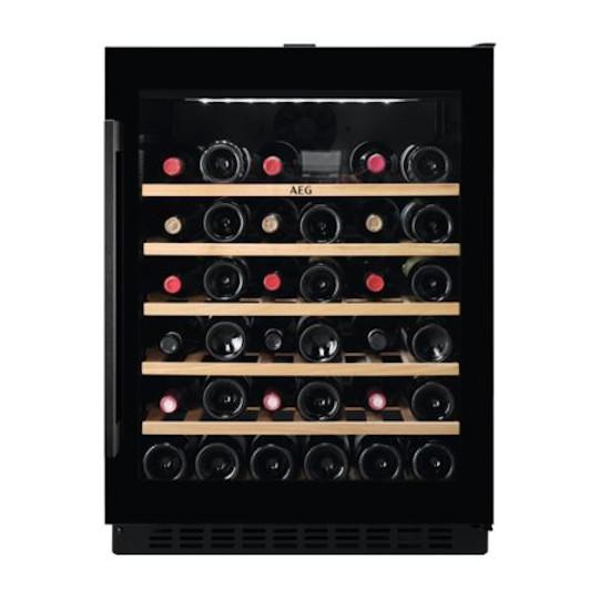 Art. AWUS052B5B# -Cantina vino SingleZone - H820, W595 ; Capacità totale 52 bottiglie Bordeaux da 0,75 l; Ventilazione dinamica con umidità superiore al 50%; Indicazione digitale della temperatura regolabile da 5 a 18°C; Illuminazione a LED; 6 ripiani di cui 5 in legno; Porta con triplo vetro contro i raggi UV; Maniglia a vista; Porta reversibile con apertura a destra; Classe energetica G; Silenziosità 42 dB(A); N-ST; Estetica nera