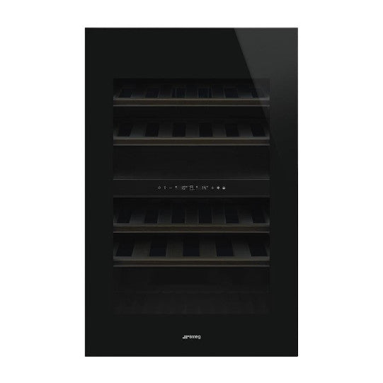 Art. CVI040BE- Estetica Universale Vetro porta anti UV Apertura porta con spintore elettronico Ventilato Tipo di display: LED Comandi touch Allarme temperatura Allarme porta aperta Sicurezza bambini Tipo di compressore: A vibrazioni ridotte Cerniere a fulcro variabile Posizione cerniera: Destra Capacità massima (bottiglie 0,75lt): 60 Sbrinamento: Automatico Zone di temperatura regolabili: 2 Tipo di controllo della temperatura: Elettronico Gamma temperature: 5-20° C Numero ripiani estraibili: 4 Ripiani estraibili su guide telescopiche Numero ripiani fissi: 1 Materiale ripiani: Legno Classe energetica G